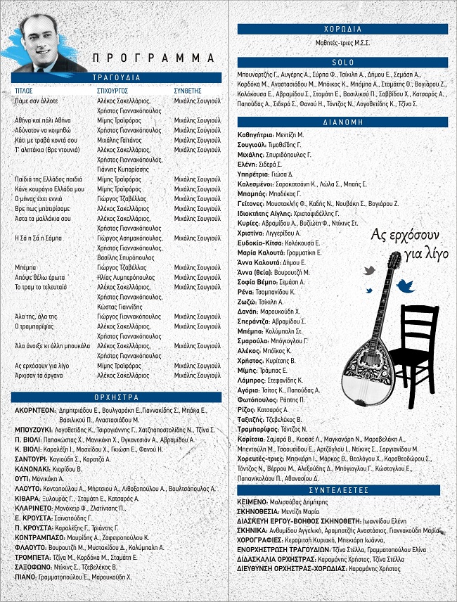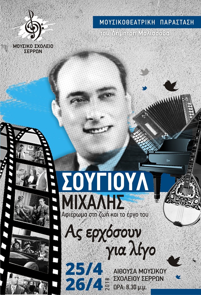 Ο Σύλλογος Διδασκόντων και ο Σύλλογος Γονέων και Κηδεμόνων του ΜΣΣ σας προσκαλούν στην παρουσίαση της μουσικοθεατρικής παράστασης του σχολείου μας, βασισμένης στο θεατρικό έργο του Δημήτρη Μαλισσόβα “Ας ερχόσουν για λίγο”, ένα αφιέρωμα στη ζωή και το έργο του συνθέτη Μιχάλη Σουγιούλ. Θα πραγματοποιηθούν δύο παραστάσεις, την Τετάρτη 25-4-2018 και την Πέμπτη 26-4-2018 στην αίθουσα εκδηλώσεων του Μ.Σ.Σ. Ώρα έναρξης, 20:30.